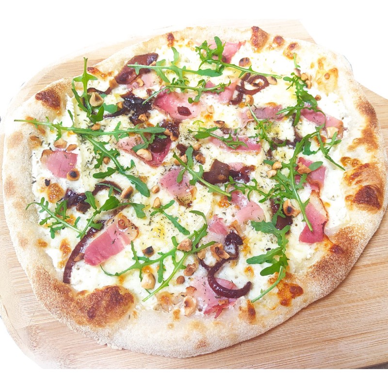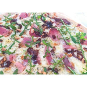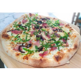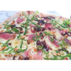 Crème, mozzarella, jambon cru, tranches de Brie, oignons caramélisés au miel, noisettes grillées, roquette, thym.
